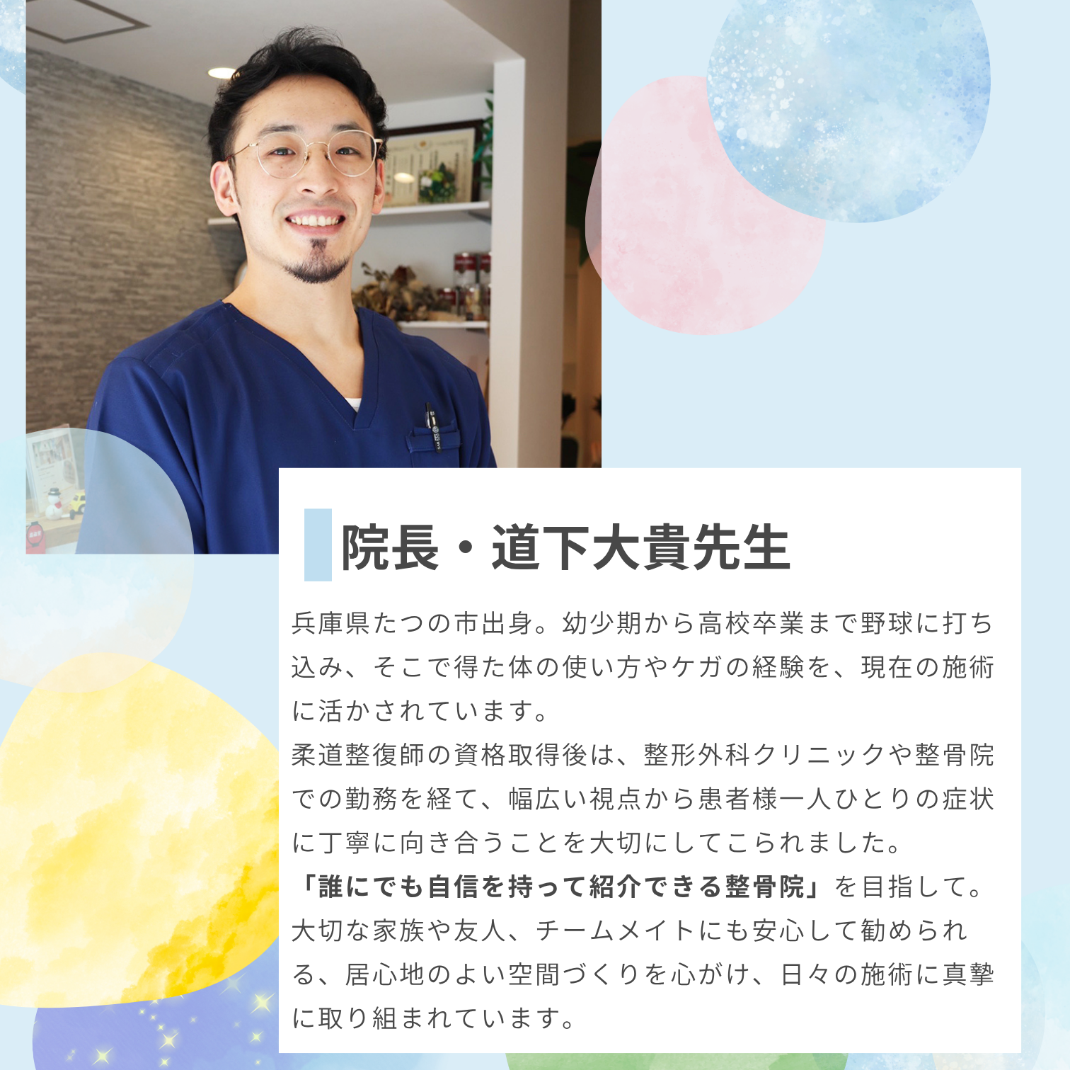 院長の道下先生は、丁寧なカウンセリングを通じて、患者さん一人ひとりの身体の悩みに真摯に向き合っています。既存の施術プラン以外にも、その日の身体の状態に応じたオーダーメイドのアプローチで対応している点が、多くのリピーターさんに支持されています。また、施術後には具体的で分かりやすい健康アドバイスを行うなど、患者さんが「心地よい毎日」を目指すための後押しも、とても心強いです。