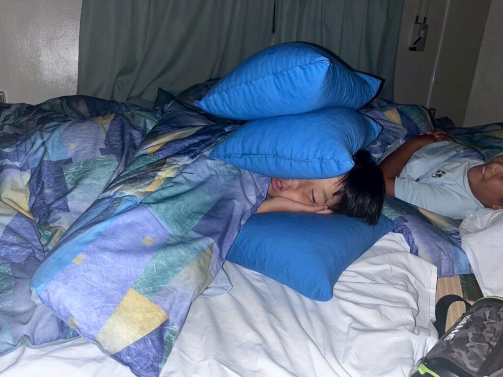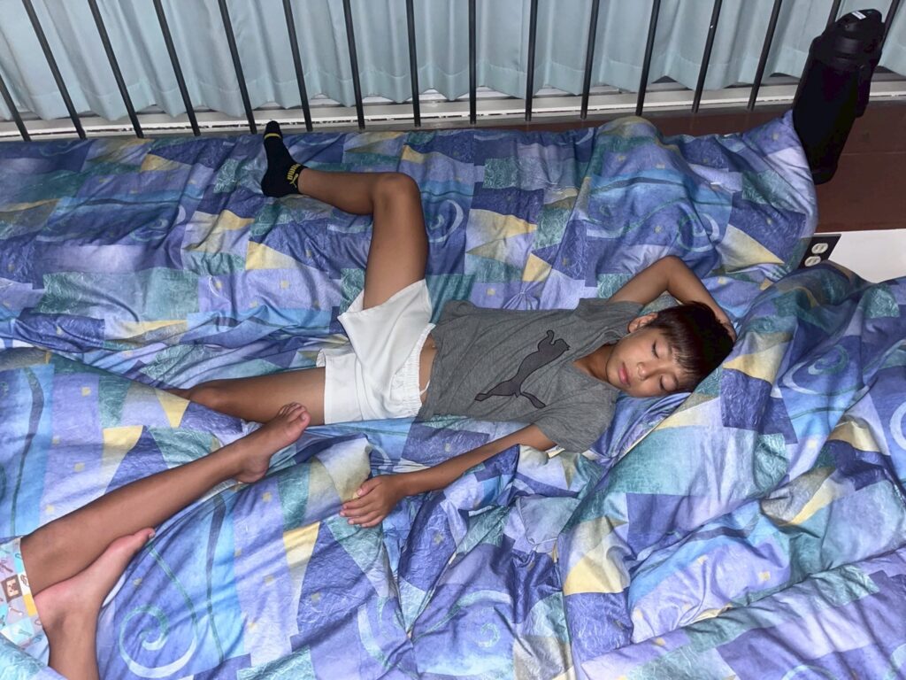 自分たちで頑張って敷いたのにすぐにずれてしまうシーツ、慣れない枕、どんなに探しても見つからないパジャマ、虫が出てくる洗面所!!