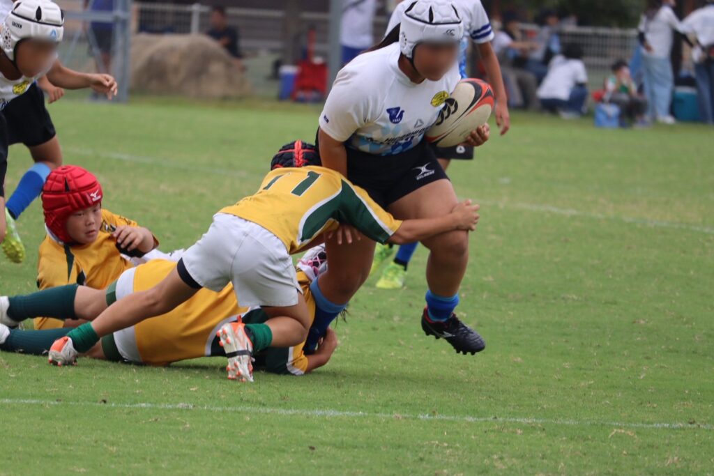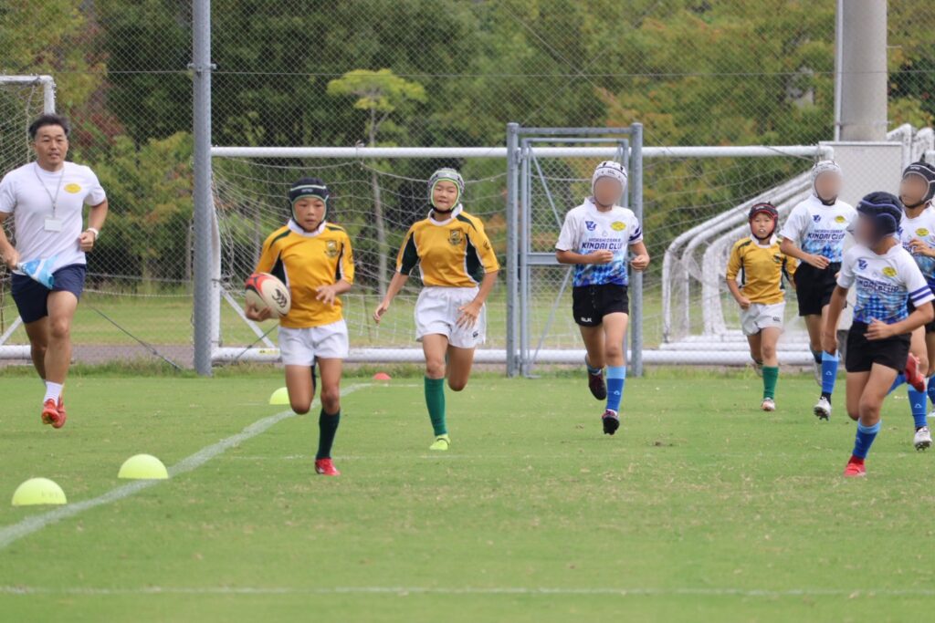 初戦は「東大阪KINDAIクラブ」さんとの対戦です。序盤に先制されるも、粘り強いディフェンスからボールを奪い返し、見事トライ! 5対5の同点に追いつきました。皆で最後まで諦めず試合を進めましたが、最終的に45対10で敗戦となりました。