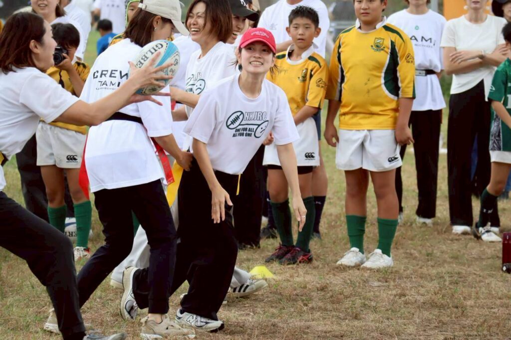 尼崎スポーツの森ラグビーフェスタでは、「ママタグ」試合があります。ママたちがラグビーボールを持って奮闘。たった5分間小さなコートでラグビーしただけで息切れしてしまいました。25分間コートで走り続ける選手たちのすごさをママたちも痛感して、あらためてたくましさを実感しました。そしていつもよりたくさ子どもたちを褒めることができました。