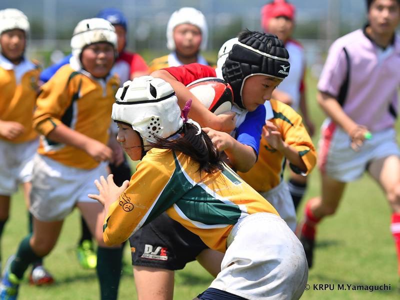 *8歳のときから本格的にラグビーを始め、弟の仁くんと共にチームに在籍しました。果敢にタックルに向かう愛琳さん(手前の白ヘッドキャップ)。
